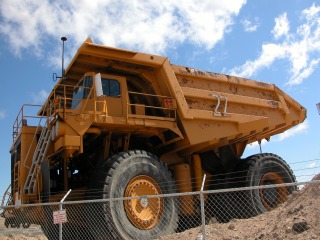 This is one of their older trucks. It is not the latest and largest of the new fleet. It is a190 Ton truck meaning the bed can carry 190 tons. The newer trucks hold 240 Tons. The tire on this thing is 11 feet high and 3 feet wide. The tire weighs 6305 pounds. Normal tire life is 9,000 hours but since they are run 24 hours by 7 days a week one year is 8,736 hours. |