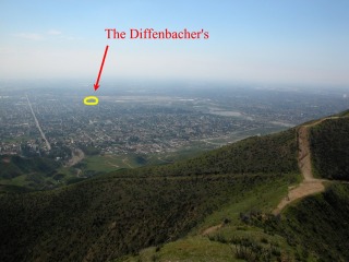 Looking down the mountain I have circled our house. At this point we are about 2,800 feet above it. I borrowed a GPS to take on the hike because I wanted to know how far we hiked and how much change in elevation. |
