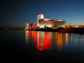 A night shot of the hotel we stayed in, the Riverside Hotel and Casino. This