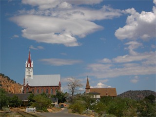 This view shows a couple of the churches. Inside the church on the left has very beautiful and ornate woodwork and many stained glass windows. Virginia city was home to the Comstock Lode. |