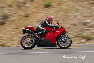The highway is currently closed again due to the fires in the Angeles National Forest. The picture to the left shows on of the areas where the road washed out in 04-05. They build a new bridge that allows the hillside to washout under the bridge now. Below is one of the crotch rockets out playing. They will be dressed in full race leathers. This guy is kind of tame as his angle of lean is not very extreme but it is not unusual to see them flying around like it is a race track leaned all the way over dragging a knee pad. WRONG. That's why we go in the afternoon. |