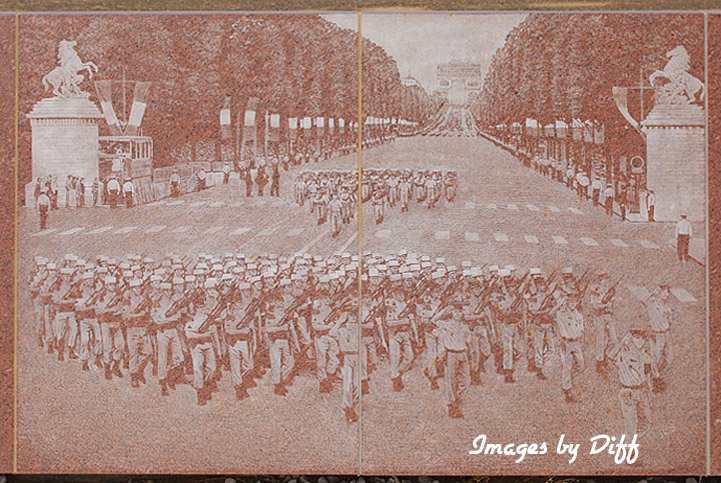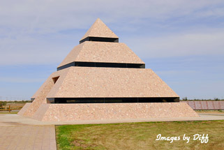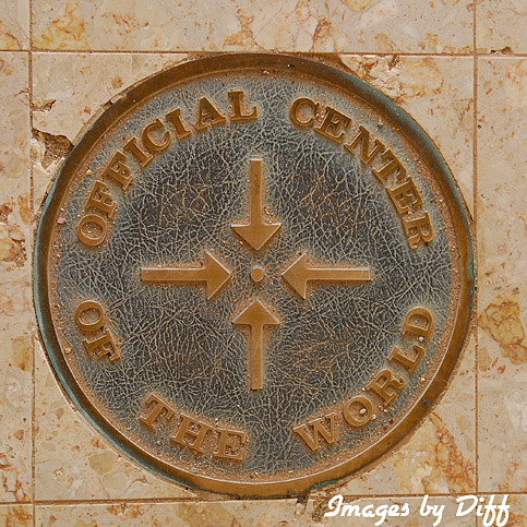 The arm used for the sundial is a bronze replica of Michelangelo's Arm of God painted on the Sistine Chapel. Also on the grounds is section number 12 of stairs from the Eiffel Tower, The Church on the Hill and the Museum of History in Granite. This Museum of History in Granite is the most ambitious undertaking of Jacques-Andre Istel which consists of 416 granite panels. Inside this pyramid is the plaque marking the "Official Center of the World". |
