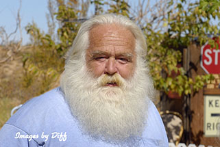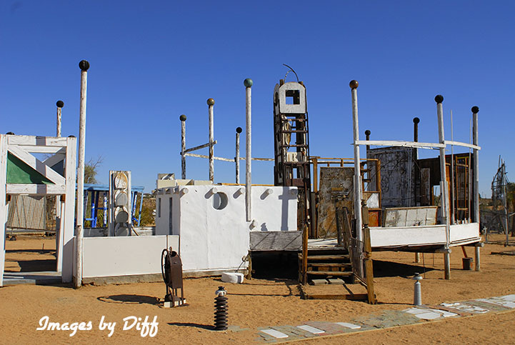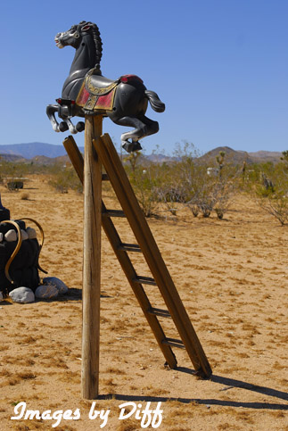 We were at one studio and were intrigued by the art work in a neighbors yard. We went off wandering this guys place and he came out. If he doesn't play Santa Claus he should. The picture to the left he explained was so when people wanted to get up on their high horse they could. He was enjoying showing us and explaining his yard art and we were enjoying hearing what they meant. The picture below is of Noah Purifoy's assemblage art. This building is called "The White House". Hmm if you look close you will see toilet seats and on the main floor there are toilets. On 7.5 acres Noah's art is scatter around. This was NOT part of the art tour but we found it by talking to people. Same as the gentleman and his high horse. |