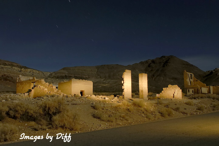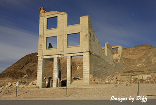 During boom times for these towns much infrastructure gets built to support the miners many needs. The largest being to help them get rid of any gold they had found. Many saloons and brothels spring up to help them unload their gold. But also businesses that sell supplies to the miners. Rhyolite has a number of structure remains still standing. I ran into a number of photographers there during the day but when we went back at night there was only one. |