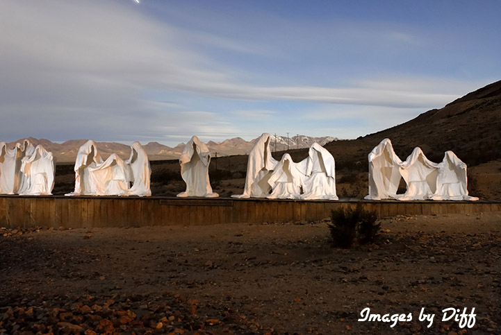 The three pictures here at the bottom are all taken at night with 5 minute or so exposures. The image of the ghostly looking people at the lower left were done on a 5 minute exposure also but during the exposure I walked up to each grouping and flashed them with my flash to help them stand out even more. Karen was amazed that I could walk across the picture while it was being taken, flash each group of statues yet I didn't show up in the finished product. The statues are part of the Goldwell open air museum just outside of town. They are a Belgian artist's interpretation of the last supper. |