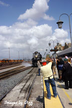 We were both surprised by the size of the crowd. We also learned that in order to have the steam train on the tracks it has to be accompanied by what they call a helper locomotive. The helper locomotive will supply power in case something happens to the steam train. They can not have a broken down locomotive blocking tracks that carry freight. In this case there was an Metro Link locomotive right behind it. |