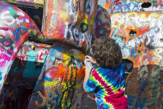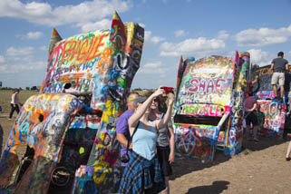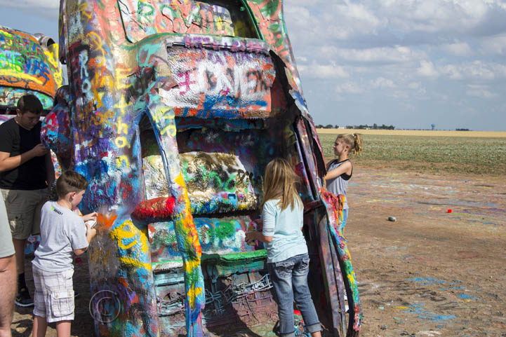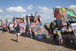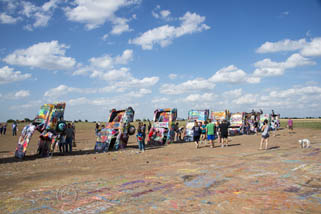 Cadillac Ranch, located in Amarillo Texas, is a world famous Route 66 roadside attraction. We were driving to Cleveland by Freeway but had to make a couple stops on Route 66 to film a few videos for the grandkids who love the Cars movies. We wanted them to know that some of the places in the movie really exist. We have been volunteering at the Route 66 museum in Barstow CA for about 15 years now and get visitors from all over the world and anybody driving Route 66 through Texas stops at certain things and Cadillac Ranch is one of those stops. The silhouette of the Cadillac fins sticking up in the air is even used as the mountains in the Disneyland cars land area. |