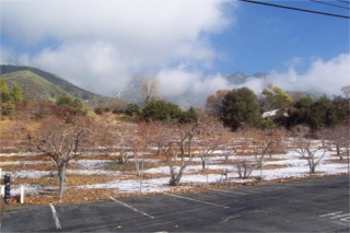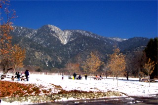 Oak Glen is at an altitude of just over 5,000 feet and like Julian is known for its apples. There are many apple orchards and barns selling apples. This photo was taken at the Los Rios Rancho orchard. The kids were just having a ball playing and throwing the snow. It was obvious they didn't live here by their fascination with snow. |