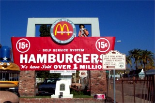 The original McDonalds was started here by the McDonalds brothers Maurice and Dick. Originally it was a B B Q restaurant with car hops. In 1948 they closed that. Then a few months later in December of 1948 they opened the original McDonalds featuring the "Speedee Service System". Hamburgers were $0.15 and fries $0.10. Ray Croc, a milk shake machine salesman, convinced them to sell him a franchise in 1954. Then in 1961 he bought them out completely except this store location on 14th and E streets in San Bernardino. Today it is the corporate offices of Juan Pollo Chicken and an unofficial McDonalds museum. Well worth stopping for the McMemories. |
