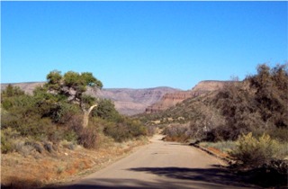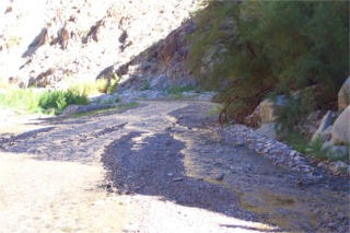 dry, dusty stream bed in a small canyon, past clumps of trees and bushes,